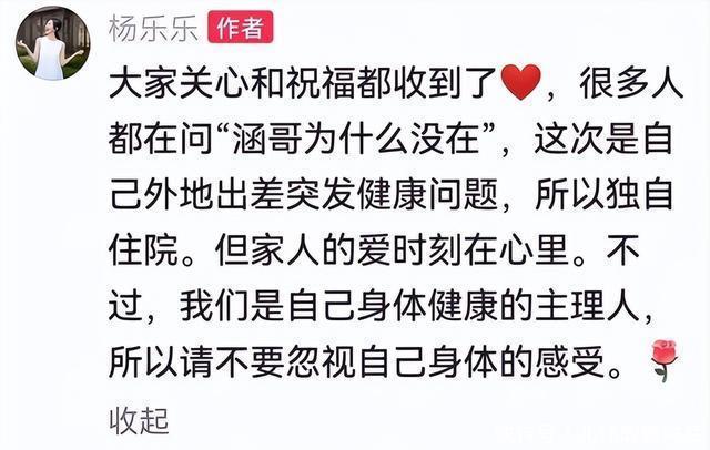 从视频中可以看得出那会的杨乐乐整个人都很虚弱,一个人躺在病床上看起来很难受,不过好在不是什么大问题,在经过治疗后她也发视频给大家报平安, 视频中的杨乐乐看起来状态挺好,也感谢大家的祝福,不过评论区的网友们更关心汪涵去哪了,怎么妻子身体不舒服他却没了影,